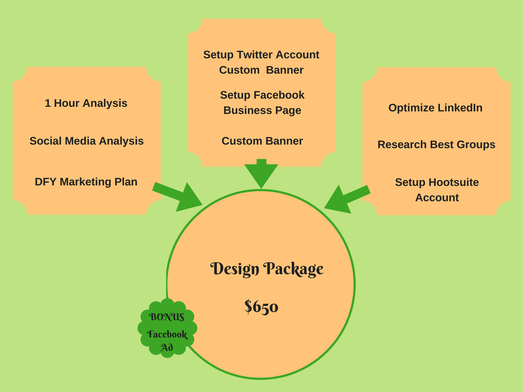 The Design Package will bring Social Media into your business. New accounts will be designed and setup. Your Social Media Presence will be created without sacrificing your time and/or the need to learn new skills.